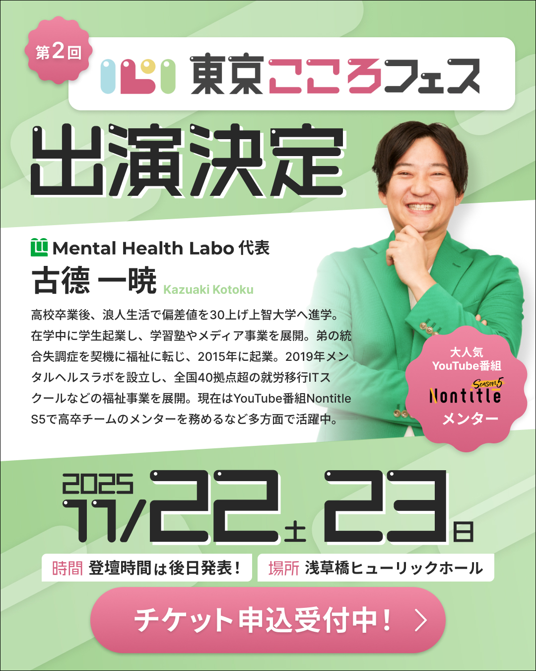 東京こころフェスは安心&信頼できる【医療機関監修】で業界最大級の『エンタメ×メンタルヘルス』イベントです。『癒し・学び・ひととの繋がり』をまるごと体験できる、心と身体の休憩所。入場無料(要チケット申込)&入退場自由♪ ふらっと立ち寄って、あなたのペースで癒されてください。