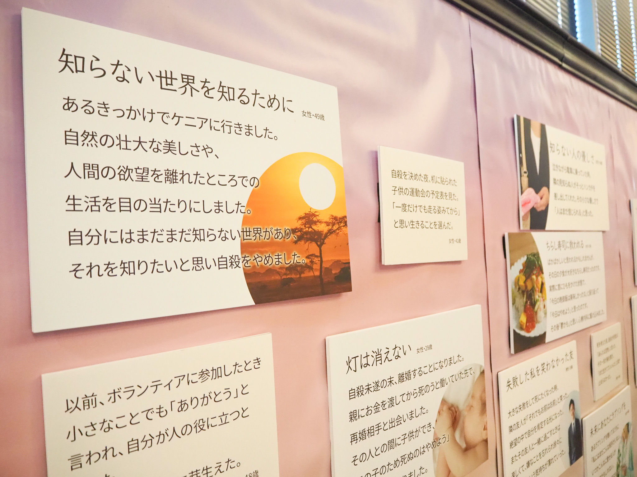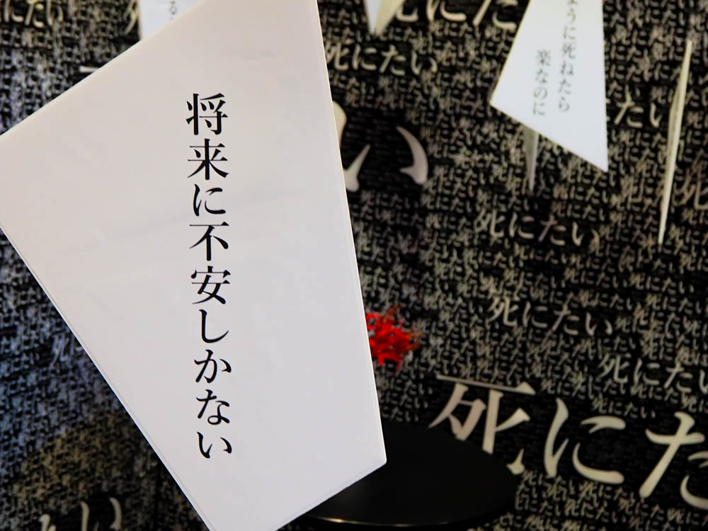生きるのをやめたいと考えた方々の実際のエピソードを展示しました。来場者からは「このこころの痛み、よくわかる。」という共感の声が多く、「つらいのは自分だけじゃないんだ。」という励みとなった展示でした。