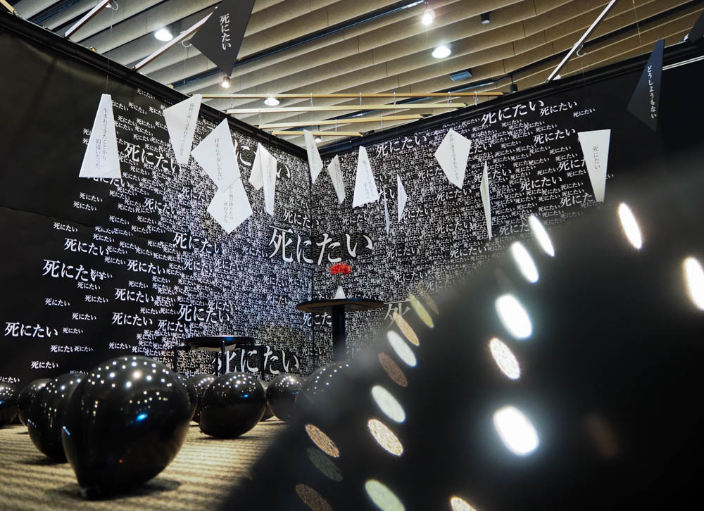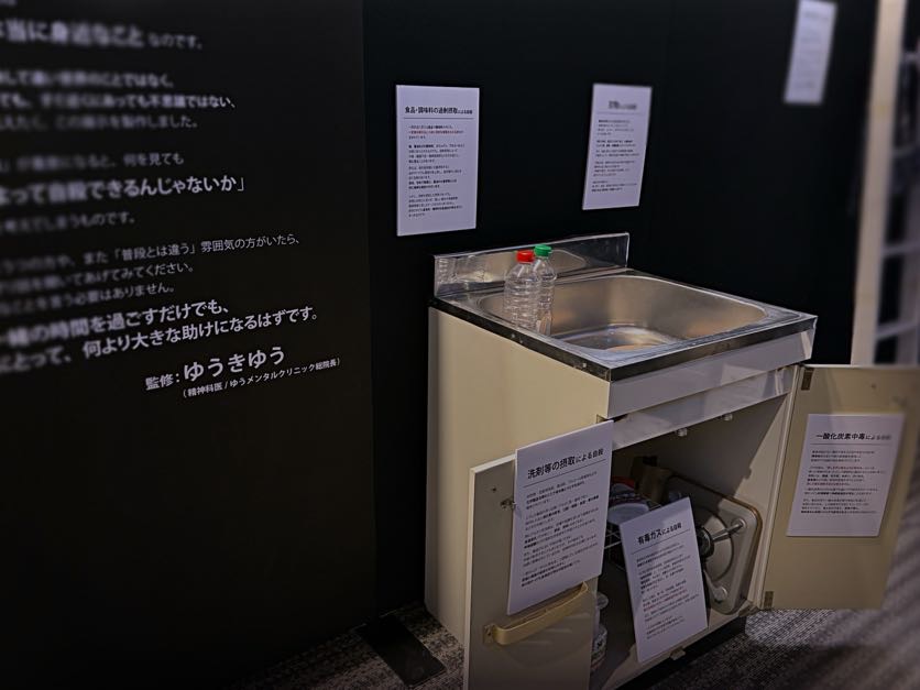 様々なエピソードから集めた「実際の自殺につながり得る危険な要素」が部屋の中に散りばめられた部屋の展示です。