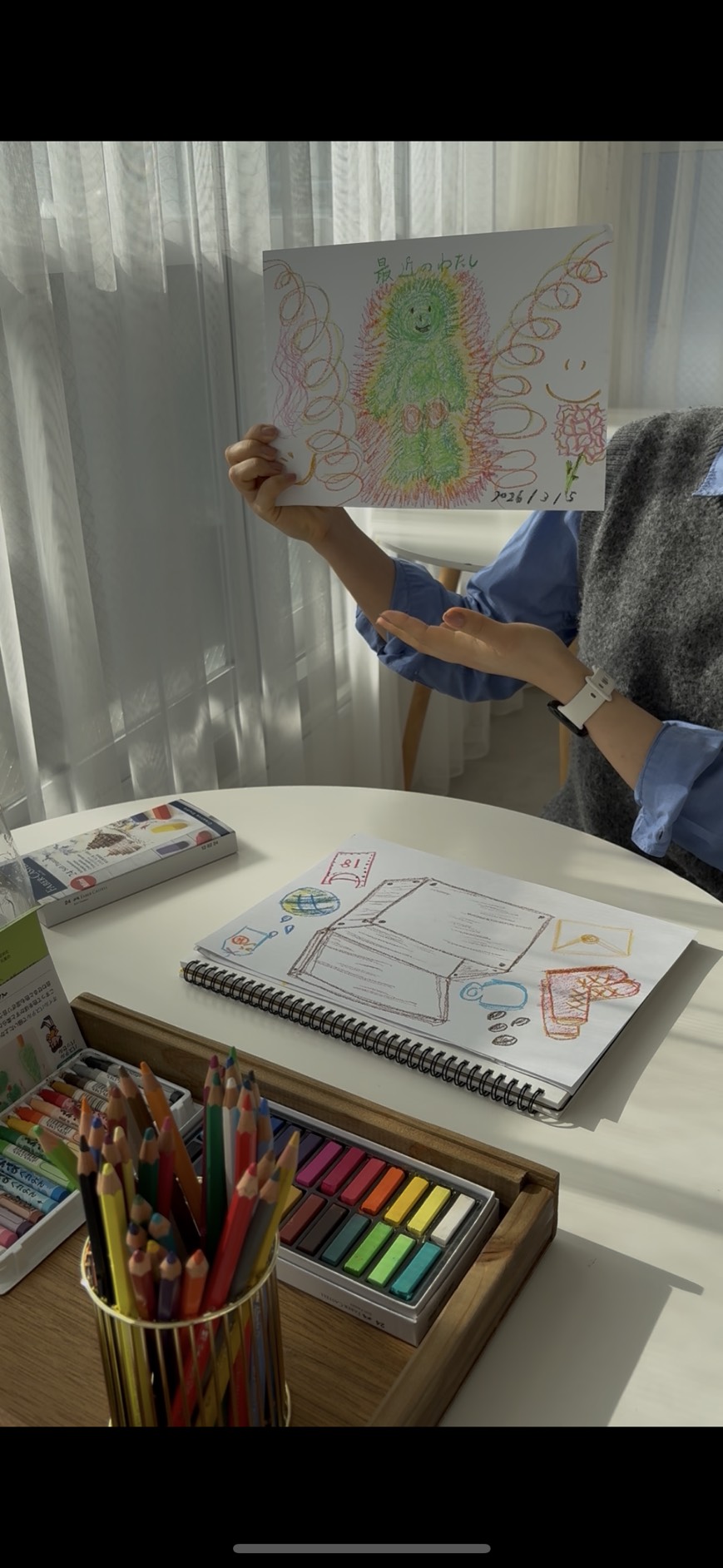 ここでは、上手な絵を描く必要は全くありません!まずはクレヨンを手に取って、今の気分や感覚のままに、ただ色を塗ったり、線を引いたりしてみてください。